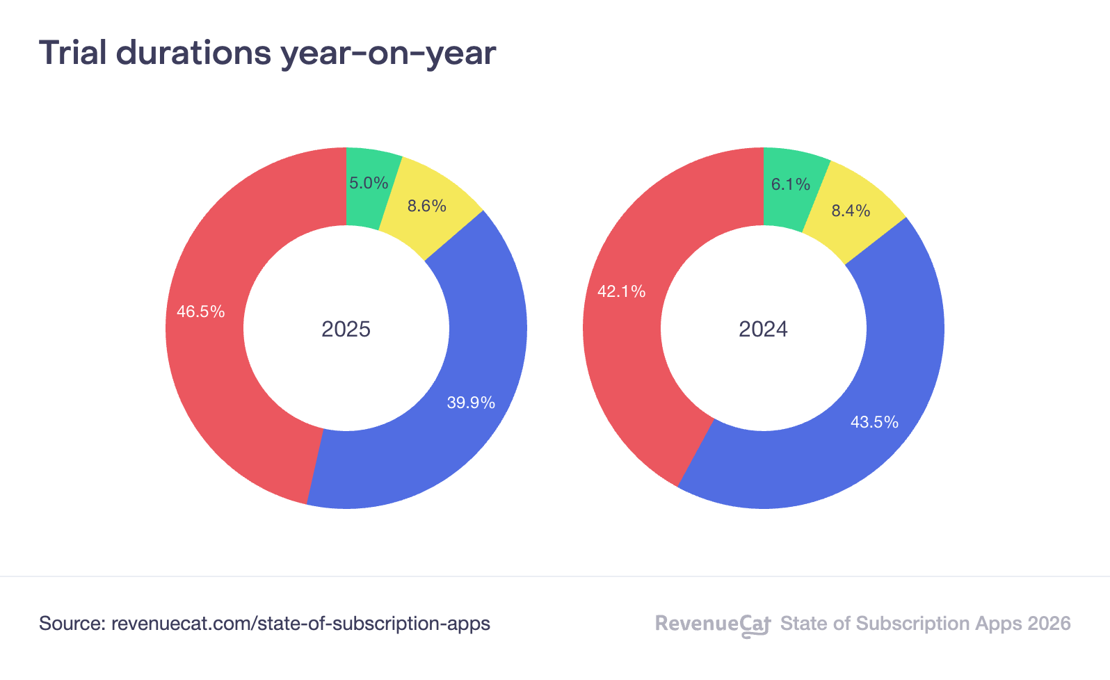 C'est l'un des paradoxes les plus frappants du rapport. Les données montrent clairement que les essais longs convertissent 70% mieux que les essais courts. Et pourtant, en 2026, la proportion d'apps avec des essais de 4 jours ou moins a augmenté par rapport à 2025.
